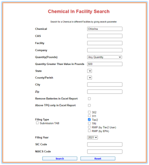 Example 2: Search for all Tier II facilities filed in reporting year 2021 that store more than 500 pounds of Chlorine.