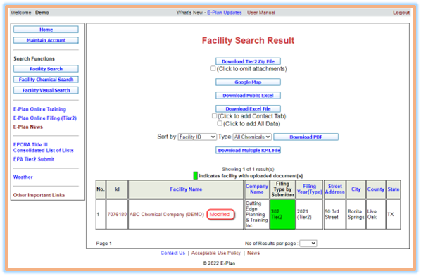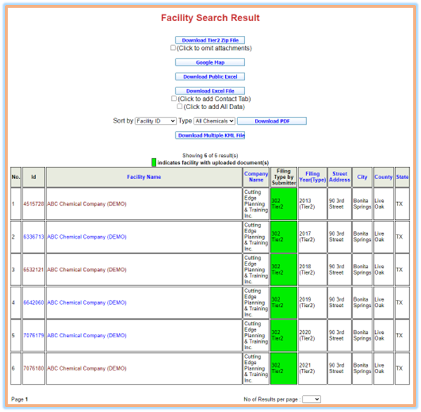 - Click the "Search" button. The Facility Search Result screen will appear.