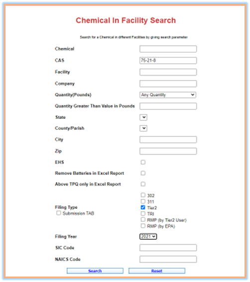 Example 4: Search for facilities that store chemical with CAS number 75-21-8 in reporting year 2021.