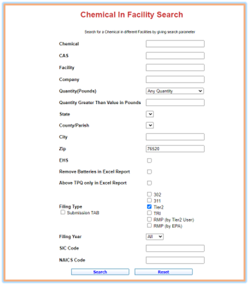 Example 1: Search for all Tier II facility records that are located in zip code 76520.