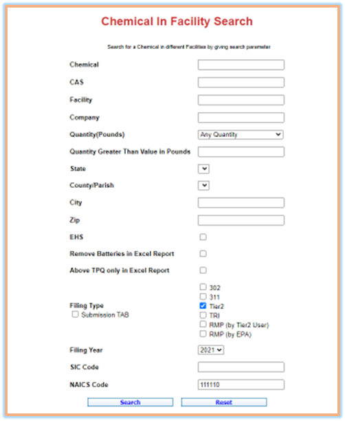 Example 3: Search for all Tier II facilities filed in reporting year 2021 that store at least one EHS.