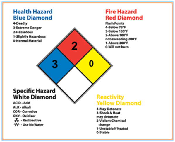 The most significant is the NFPA 704 Standard System for the Identification of the Hazards of Materials for Emergency Response (commonly referred to as the "NFPA hazard diamond"). These diamond shaped symbols are placed on containers of chemicals or materials to identify the degree of hazard associated with the chemical or material. The diagram identifies three color-coded categories of hazard for each material. Each category is divided in levels of hazard potential with increasing numbers indicating increasing hazards. The abbreviated degrees of hazard in each of these categories are given as follows: